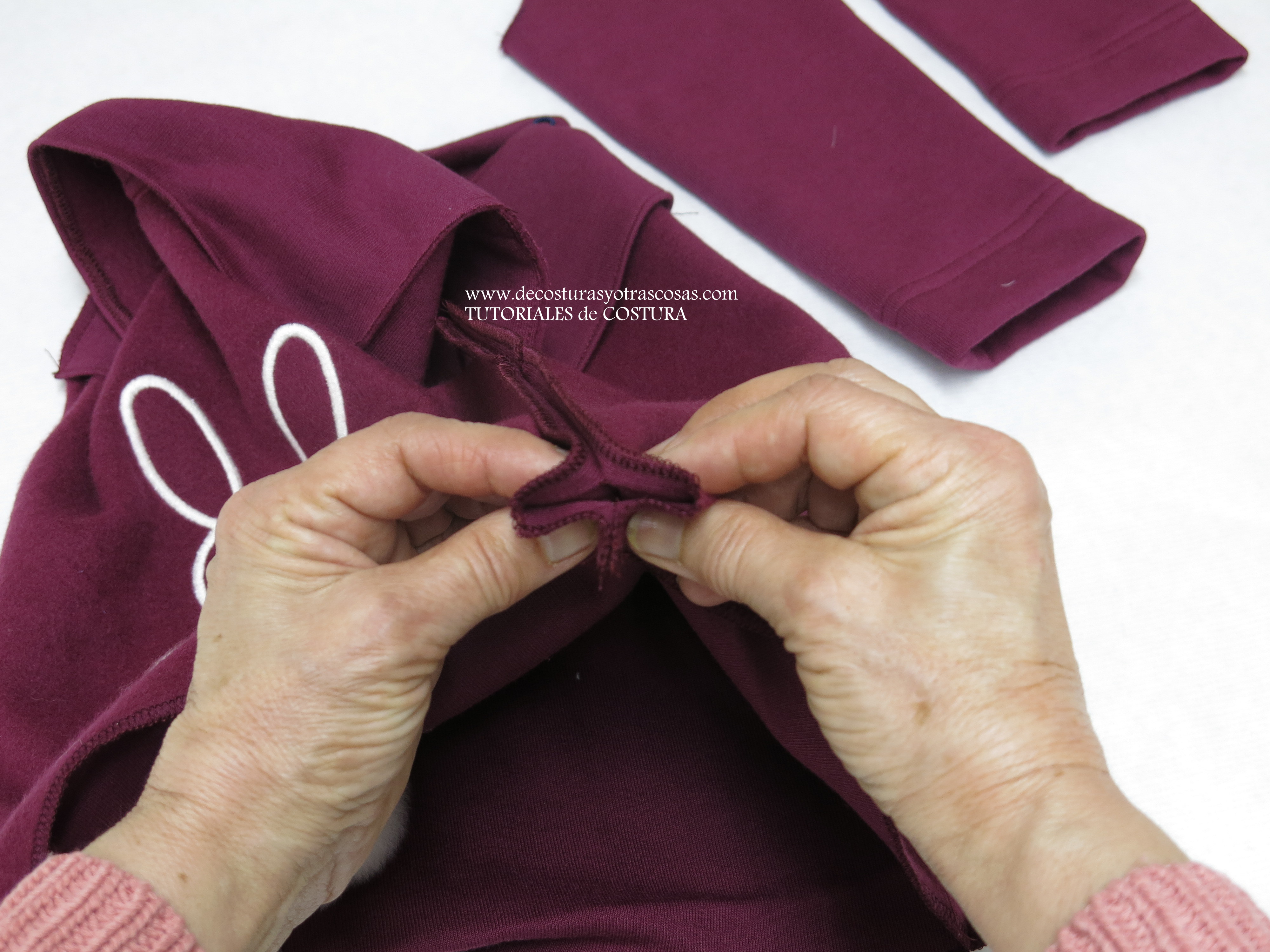 Planchamos el dobladillo de las mangas, las cerramos y le pasamos dos pespuntes paralelos prendiendo el dobladillo. Cerramos las costuras laterales de la sudadera.